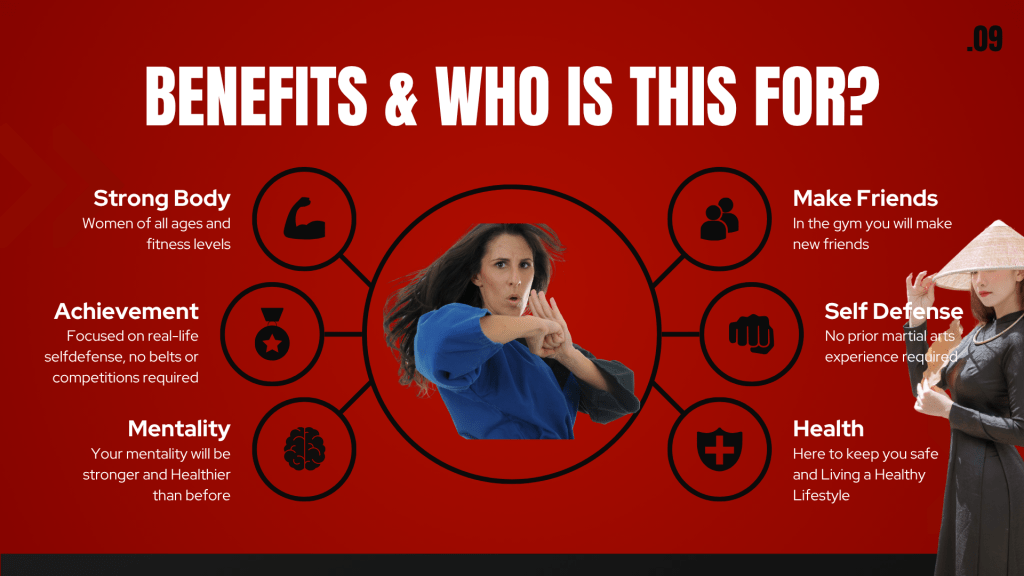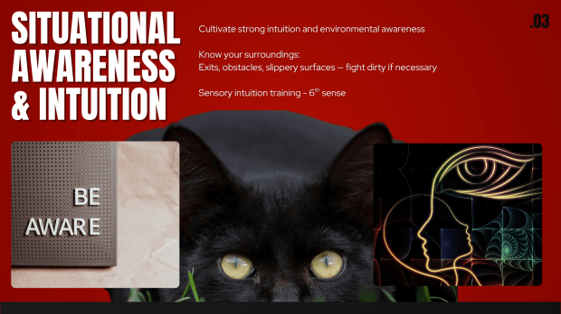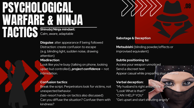- Multiple Mindset tactics (understand that no one messes with you, confident piercing eyes, confident body language, be able to not react emotionally/ fearfully when if attacked)