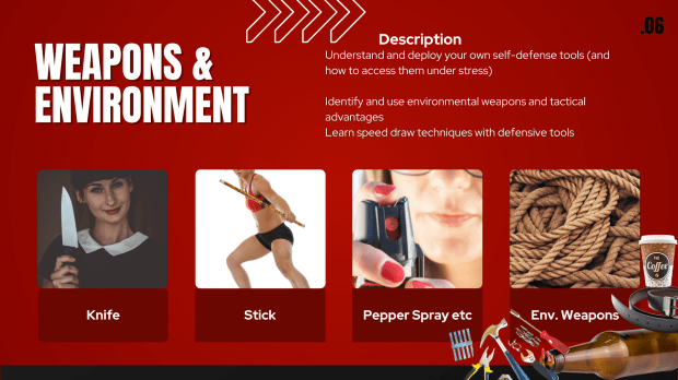 - Environmental weapons (know how to use 3 – rope/scarf/belt/sharp object/ keys